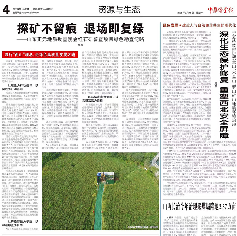 面向未来,正元地勘院将以此次项目成功实践为新起点,始终坚守地质报国初心、牢记资源保障使命,主动心系“国之大者”,在持续深耕地质找矿主业、切实履行保障国家矿产资源安全核心职责的同时,不断迭代绿色勘查技术、完善管理体系,以更严标准、更实举措推进生态保护与勘查开发深度融合,为守护祖国“绿水青山”、服务经济社会高质量发展持续贡献冶金地质力量。